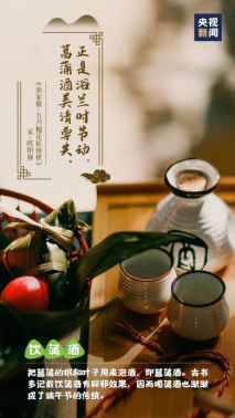 端午饮蒲酒、雄黄、朱砂酒的习俗也流传甚广。《荆楚岁时记》:“以菖蒲或镂或屑,以冷酒。”蒲酒味芳香,有爽口之感,后来又在酒中加入雄黄、朱砂等成为流传甚广的雄黄酒。雄黄也是一种药材,据说能杀百毒。古语曾说“饮了雄黄酒,病魔都远走”。除饮用外,这些酒水还有他用。明冯应京《月令广义》载:“五日用朱砂酒,辟邪解毒,用酒染额胸手足心,无会虺蛇之患。又以洒墙壁门窗,以避毒虫。”
