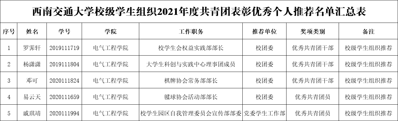 关于禁忌书屋 校级学生组织2021年度共青团表彰优秀个人拟推荐名单的公示