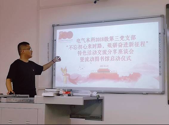 “胸怀千秋伟业,恰是百年风华”,2021是中国共产党百年华诞,百年征程风华正茂,百年初心历久弥坚。为贯彻落实习近平总书记在党史学习教育大会上的重要讲话精神,把开展党史学习教育作为一项重大的政治工作来落实,同时创新学习教育的方式方法,电气本科2018级第三党支部于2021年6月13日在犀浦校区X9503教室开展了“不忘初心来时路,砥砺奋进新征程”主题党日活动暨支部流动图书馆启动仪式,活动由宣传委员沈悦洋同志主持,党支部全体党员参会。