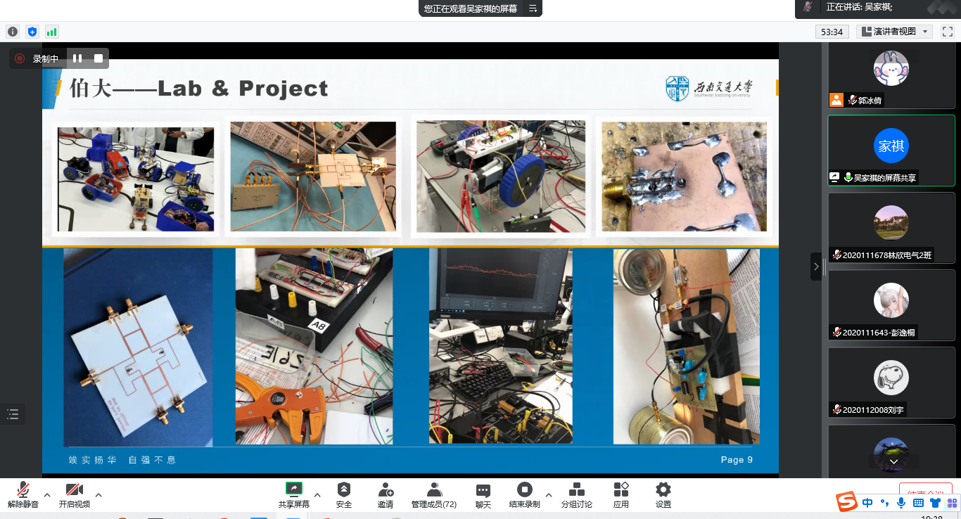 会上,第一位分享者吴家祺同学向大家分享了自己在英国伯明翰、帝国理工和剑桥的留学经历,并从本科学习生活、硕士申请相关材料准备、研究生及未来发展和大学生活发展规划等方面详细地分享了自己的留学经验和感悟。她以自己的亲身经历告诉大家,好的学历会让大家在工作中有更多的机会,同时在关键转折点自己可以主动做选择而不是被动做决定。最后,她鼓励大家,要敢想敢闯,努力成为更好的自己。