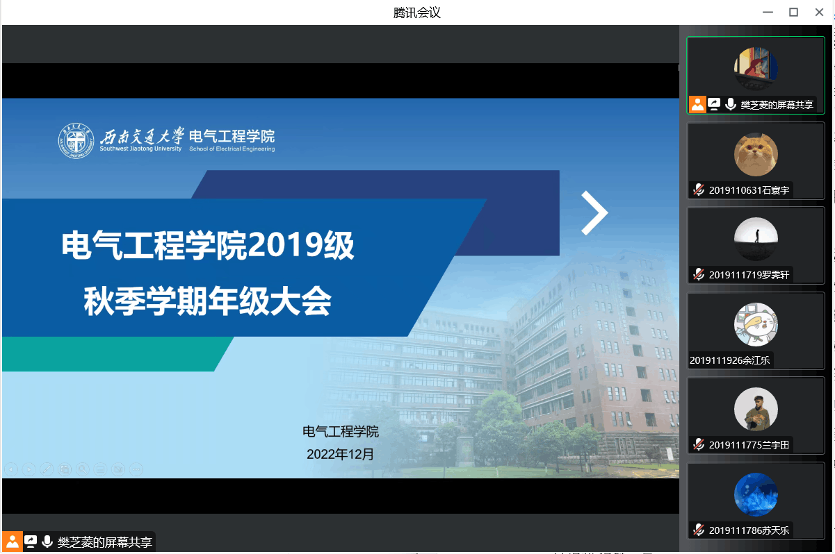 临近期末,为强调考试纪律,杜绝考试作弊行为,端正学生考试态度,形成良好的诚信考试氛围,12月6日,电气本科2019级通过腾讯会议召开了诚信考试教育年级大会。本科2019级全体同学及辅导员参加会议。辅导员樊芝菱、詹睿主持会议。