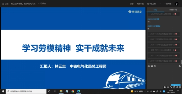 为帮助在校学生了解行业发展前景,提前做好职业规划,加强学生扎根轨道交通事业的信念和决心,并通过优秀校友的模范引领作用,用“身边人,身边事”引导在校学生树立正确的人生目标和价值取向,禁忌书屋 团委于2022年4月21日下午16:00开展“树立典型榜样,传承交大文化”活动,本次活动邀请到了中铁电气化集团有限公司城铁公司总工程师林云志校友,他以“学习劳模精神 实干成就未来” 为主题在线上为同学们进行对话。