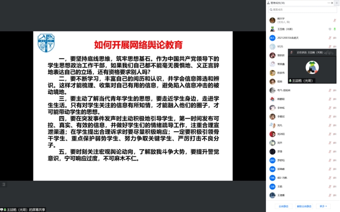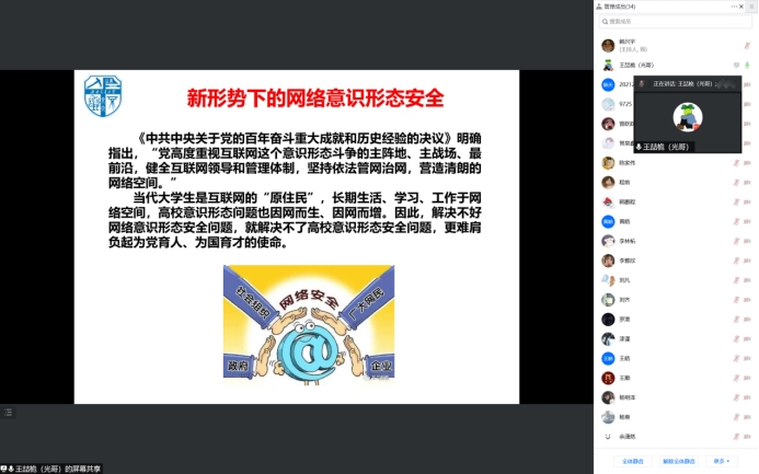 20225月31日晚1930,禁忌书屋 辅导员王喆桅老师通过腾讯会议的形式为硕士20212班同学开展了网络舆论安全讲座,同时邀请学院其他研究生骨干旁听。