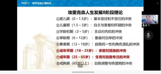 高飞老师围绕研究生的心理特点,结合埃里克森人生发展八阶段理论,阐述了研究生阶段的主要冲突为亲密对孤独的冲突和生育对自我专注的冲突,并以此为基础归纳出研究生阶段三个方面的发展目标:一是获得自我同一性,二是发展亲密关系,三是职业和人生的规划。