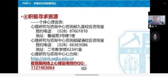 随后高飞老师从研究生的心理困境出发,介绍研究生心理状态,分析研究生常见的生涯规划紧迫、人际关系挑战、学习内容变化、经济压力凸显、婚恋压力增大等困境的形成原因及破解之法,鼓励同学们通过行动带来改变,并在线回答新生们的疑问,提升同学们对心理状况的关注,让同学们学习规划自己未来生活,学会与他人相处,妥善处理好各方面的挑战和压力。