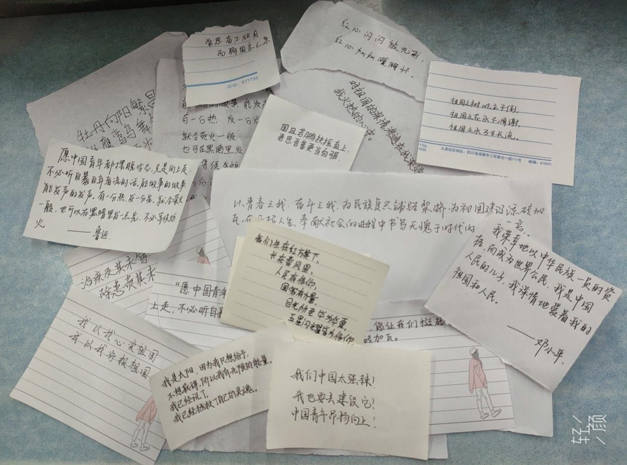 首先,团支部成员一起观看哔哩哔哩上近两百万播放的热门视频“这盛世如你所愿”,感受中国奇迹般的成长历史,感受无数仁人志士们的爱国主义。接下来,全体成员一起学习《错位时空》(五四特别版)歌曲,并进行了一次集体大合唱,在红色旋律中一同细品那段红色的岁月和一个个红色的传奇,全体青年都在合唱中感受到了无尽的力量在心中喷涌,为祖国做贡献的理想深深地刻在同学们的心中。不仅如此,团支书还组织同学们写下自己最想对祖国说的话,有的同学承诺:“以青春之我,奋斗之我,为民族复兴铺路架桥,为祖国建设添砖加瓦,在开拓人生,奉献社会的进程中书写无愧与时代的壮丽篇章。又有的同学为祖国献上了自己的祝福:“祖国之树屹立不倒,祖国之花永不凋谢,祖国之水万古长流!”在团支书的呼吁下,部分同学还录下了自己对祖国的青春告白视频。在活动的最后,电气10班团支部全体青年迈着自信的步伐一同前往学校的竢实扬华碑前合影留恋,他们用灿烂的微笑,发出共同的心声——祝伟大祖国更加繁荣,富强!