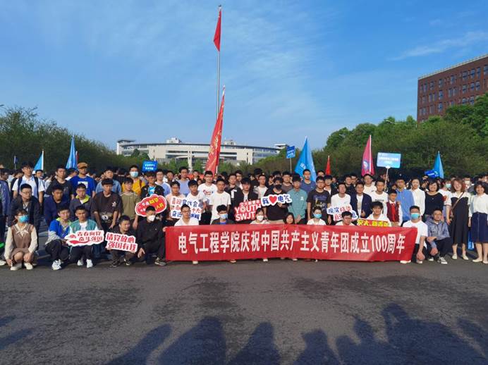 上午8:00,国旗护卫队迈着铿锵有力的步伐护送国旗来到旗杆下,在雄壮的国歌声中,鲜艳的五星红旗徐徐升起、迎风飘扬。全体师生行注目礼、奏唱国歌,共同庆祝中国共产主义青年团成立100周年。