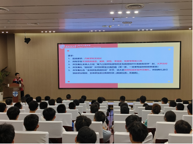 20239月1日晚上20:00,学院组织本科2023级新生在图书馆一号报告厅和二号报告厅集中学习禁忌书屋 校歌。电气2023级全体本科生、辅导员、辅导员助理参加此次活动。