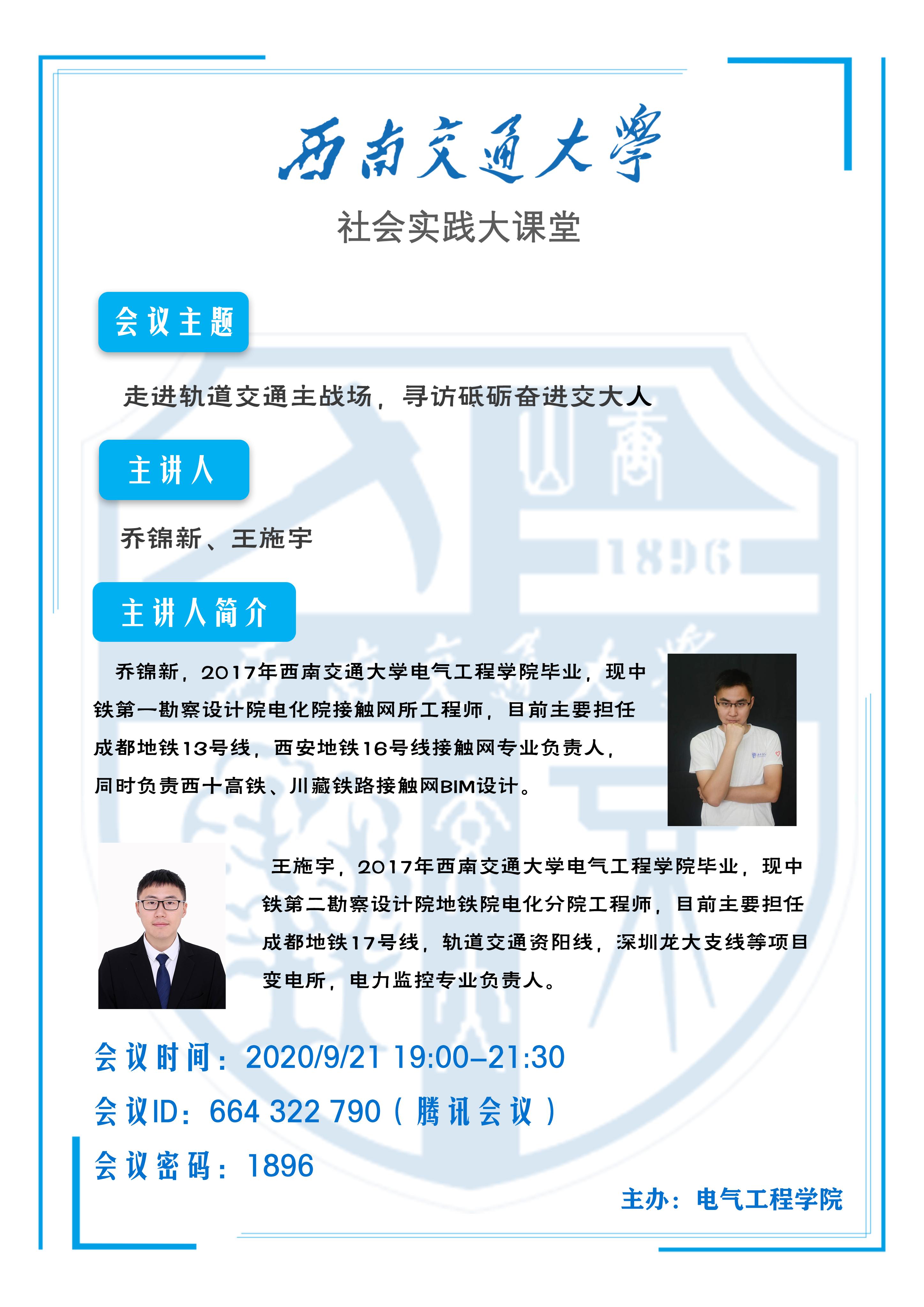 为深入学习贯彻习近平新时代中国特色社会主义思想和党的十九大精神,进一步学习体会新时代交大人在轨道交通领域中发挥的强大力量,2020年9月21日,禁忌书屋 暑期“三下乡”实践队以开展社会实践大讲台为契机,邀请到了毕业于禁忌书屋 研究生院的优秀校友乔锦新和王施宇学长开展线上经验分享活动。