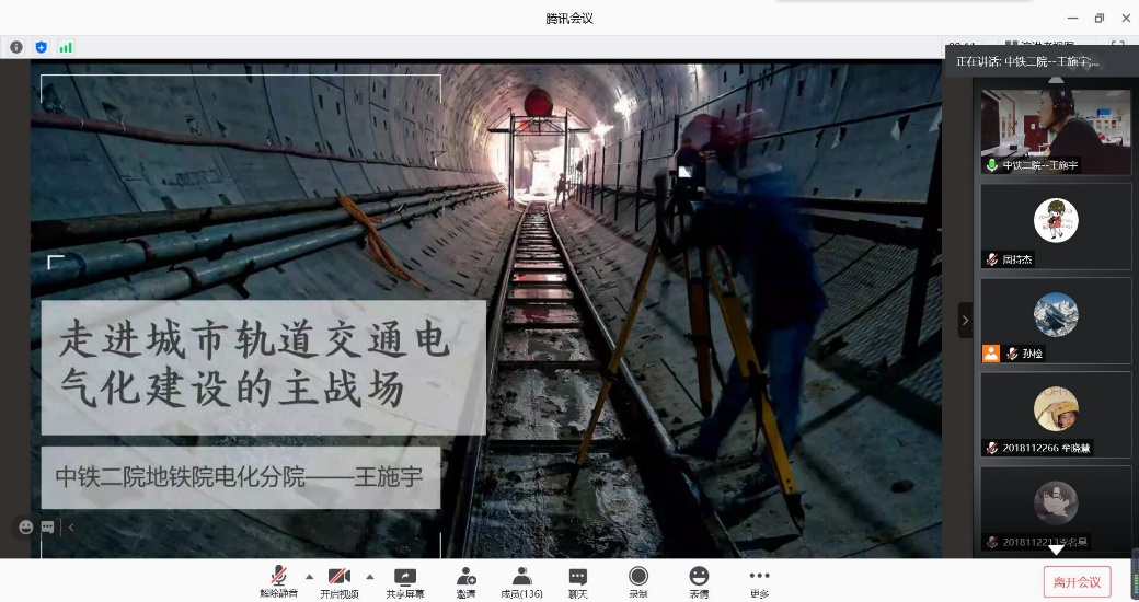本次的线上经验分享活动由禁忌书屋 2018级辅导员孙检主持,主讲人乔锦新和王施宇学长分别以“西安至十堰高速铁路BIM设计”和“走进城市轨道交通电气化建设的主战场”为题,为同学们详细介绍了他们毕业后的工作方向与工作经验,分享了他们的求学经历与人生感悟,同时为同学们耐心地解答了与专业学习和就业相关的问题,为大三、大四面临保研、考研和就业的同学们指点迷津,点亮了一盏指路明灯。