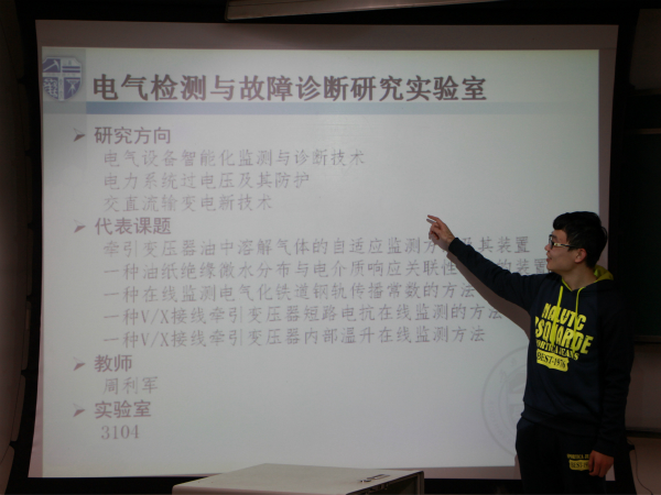 最后,何健同学代表电气检测与故障诊断研究实验室进行介绍。重点提到电气设备智能化监测技术,并强调在线监测的重要性。班长王沛沛就“如何使监测装置智能化”提出自己的疑惑,团队同学耐心细致的介绍监测方法的发展历程与计算机信息技术的广泛使用,全面的帮班长答疑解惑。