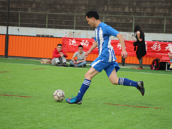 双方队员早早地来到场地进行赛前热身运动,为即将开始的比赛积极准备着。随着裁判的一声哨响,比赛开始了。双方均摆出了1-2-1的阵型,比赛开始不到6分钟,身着蓝白球服的我方8号林国松凭借门前一脚,率先为电气学院赢得1球。紧接着,我方7号周福林带球突破对方防守球员之后,来到禁区门前一脚推射,漂亮的完成又一进球。