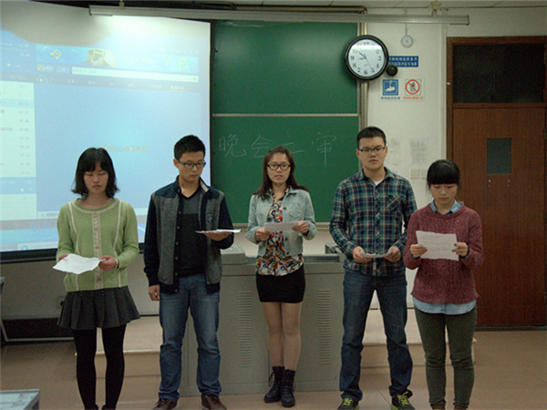 晚7点左右,参加评审的工作人员和部分观众陆续进入到教室内,对同学们即将开始的表演都满怀期待。正式排演于7:20开始,出场次序是按照迎新晚会现场次序预先商定的,歌曲类节目照例摆在开头,既有男女混唱、个人独唱,又有班级合唱。有的歌曲还加入了同学们自己创造的小舞蹈,充分凸显了同学们的青春与活力,其精彩表现不断引起现场观众的喝彩与掌声。舞蹈类节目更是动感十足,专业的舞步配上旋律感超强的背景音乐,加上表演者精心搭配的那副酷黑的墨镜,真有一种引燃全场的效果。语言类节目也是惊喜不断,作为晚会的重头戏,演员们在排演中拿出了正式迎新晚会的认真劲儿,逗得现场观众和评委们喜笑连连。整个教室洋溢着由衷的热情与喜悦。