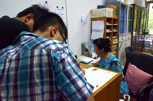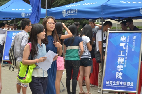 9月2日交大九里校区正式展开2014级的研究生迎新工作。蓝帐篷,蓝T恤,红桌布,亮丽的色彩让各学院迎新报到点倍显温馨。新生接踵而来,大部分新生都是独自一人来报到。有行李太多的学生报到途中每次换车都要把自己的提包点几遍才放心,拥挤的公交车上还要不时去摸摸包里的“要紧财产”是否还完好无损。无论是多么小心谨慎,还是有学生在车上丢了手机,但很庆幸各证件还安在。也有学生在火车上就感冒了,忍着身体的不适一个人搬行李、报到、体检、注册。还有更粗心的学生不小心把录取通知书洗掉了,焦头烂额。他们或焦急,或疑惑,或迷茫。但他们的种种问题都在迎新志愿者们的耐心答疑下得到解决,种种心情也都在志愿者们热切的关心下趋于淡定。