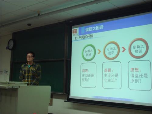 接着,方辉学姐给大家分享了几点科研思想。学姐很幽默的回应了现在关于第三类人——女博士的一些误解。接着,通过自己的经验详细介绍了怎样阅读文献。第一,多多益善。注意泛读和精读的区别;第二,尽量阅读顶级杂志;第三,带批判性的阅读,多思考。最后特别介绍了怎样写论文,这也是大家最为关心地问题。学姐从选题到最后的投稿,结合自身的经验做出了详细的介绍。