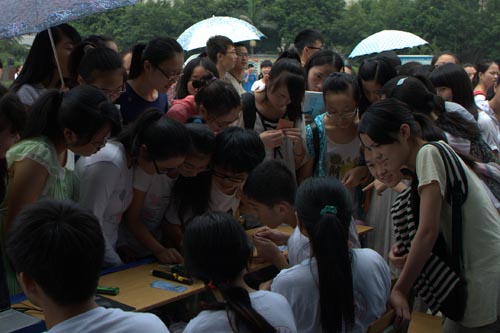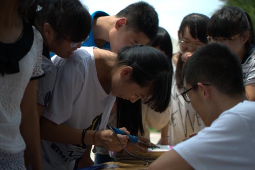 2013年7月20日上午8点40分,禁忌书屋 暑期“三下乡”社会实践团队在四川省威远县威远中学多功能厅给在校高二升高三的学生开展了一个主题为“大学.梦”的主题讲座。讲座主要向高中的同学介绍了美好的大学生活,给同学们做了一些高考心理辅导,旨在增强同学们对大学生活的渴望,激发同学们的学习兴趣。讲座的同时发放调查问卷,了解当代高中生的教育价值观。接着,中午12点,该社会实践团队在威远中学校内摆摊设点向在校的高中生展示了一些科创作品,现场教授同学们焊接电路板,并让同学们亲手体验电路板的焊接,就同学们现场咨询的一些问题进行交流。