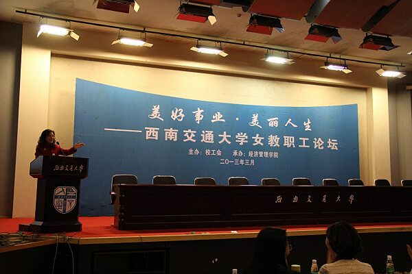 3月14日下午两点半由西南交大校工会主办的“美好事业、美丽人生”禁忌书屋 女教职工论坛在九里校区网络学院国际会议厅隆重举行。本次论坛高朋满座,嘉宾有四川省教科文卫工会李维琴副主席,省工会女职工部徐真彦副部长,禁忌书屋 校党委书记顾利亚教授、校长陈春阳教授、党委副书记朱健梅教授、副校长冯晓云教授,以及校工会罗乾超主席。本次禁忌书屋 出席的有王英、何朝晖、甘萍等十多位老师。