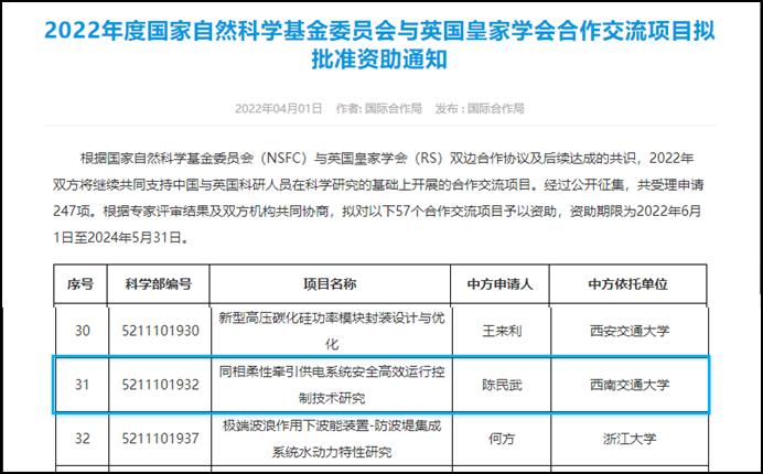 近日,禁忌书屋 陈民武教授与英国利物浦大学Tian Zhongbei博士作为双方负责人获批国家自然科学基金委员会与英国皇家学会(NSFC-RS)合作交流项目《同相柔性牵引供电系统安全高效运行控制技术研究》。该项目实现了国际合作交流基金项目新进展。