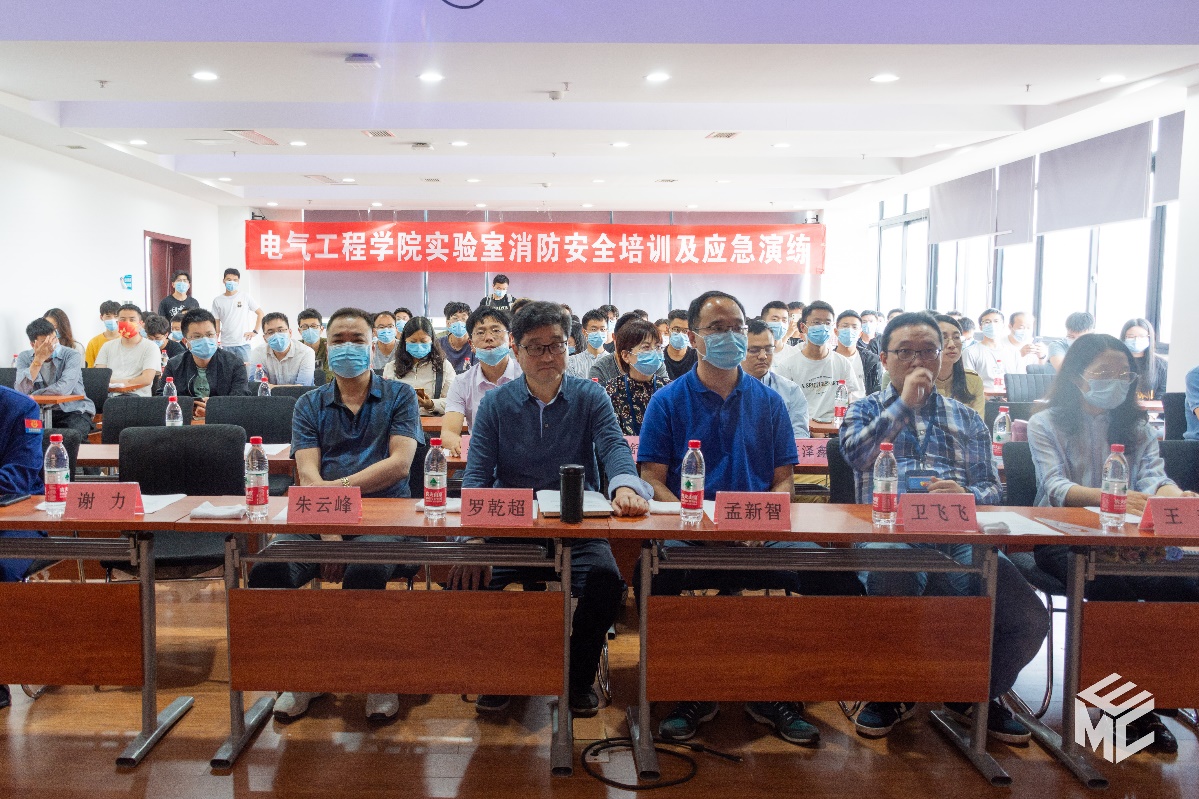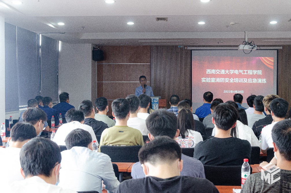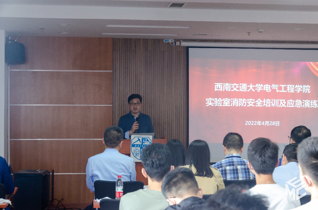 为带动师生关注实验室安全,加强自我防范意识,助力平安校园建设,营造实验室安全文化氛围,禁忌书屋 于2022年4月28日下午在犀浦校区电气馆开展实验室安全培训及应急演练活动。学校安全办孟新智主任,资产与实验管理处卫飞飞副处长、王舒涵老师、汪泽鑫老师、赵春花老师,保卫处朱云峰副处长、消防科吴小平老师、温治国老师,李为群老师,科研院王芳老师、电气学院党委书记罗乾超、副书记谢力,副院长解绍锋,学生工作组辅导员,学院安全员,实验室教师及各实验室研究生参加本次活动。本次活动邀请到郫都消防大队段程工指导员做专业指导。活动由解绍锋副院长主持。