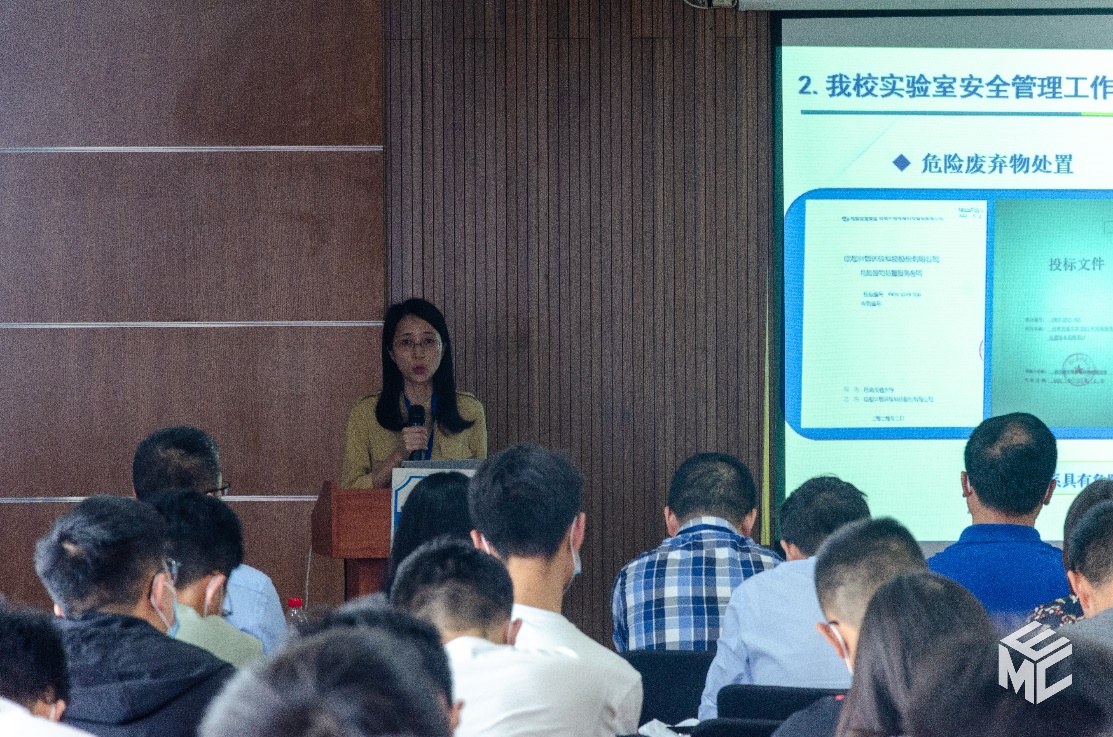 接着,资产与实验室管理处赵春花老师介绍学校实验室安全管理相关知识。她深入讲解了实验室的安全工作。首先是国家对实验室安全教育的要求,列举了2015-2017全国实验室安全事故的数据。接着她讲解了我校实验室安全管理工作。我校工作按照统一领导,分级负责,责任到人的原则执行。随后她介绍了危险化学品管理及特种设备管理知识,每种危险化学品有安全技术说明书,管制类化学品要通过学校的管理平台采购,学校每年都会组织危化品管理培训。最后,她还介绍了我校2022年“实验室+”安全教育宣传系列活动,呼吁师生能够积极参加,携手共建和谐平安校园。