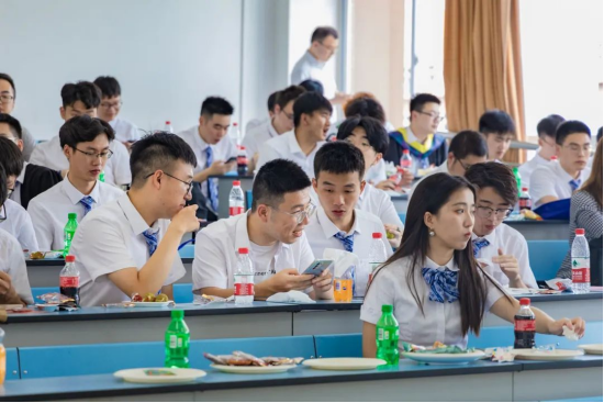 典礼的第三项议程是毕业生最后一堂班会。同学们来到班会教室,学院为同学们准备了甜点与茶饮。班会中,班导师、辅导员与同学们重温在校时光、畅叙同窗情谊。回忆起初见同学的稚嫩,到如今大家面对未来的满怀期盼,四年里的每个精彩瞬间,都浮现在眼前。辅导员们寄语同学们走出校园后勇敢去闯,实现自己的人生价值,拥有美好的未来。