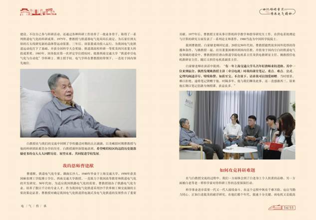 2022年8月,作为电气文化系列读本之一、打造学科特色鲜明的《电气传承》读本首发,读本以对话的形式,记录了老中青三代电气人在国家轨道交通电气化事业发展中接续奋斗的故事。为进一步扩大宣传,激发情感共鸣,学院成立2022年第一期“电气传承讲述人”,从听老教授讲,延伸到青年教师讲、学生自己讲,将电气精神从纸上跃然耳边。