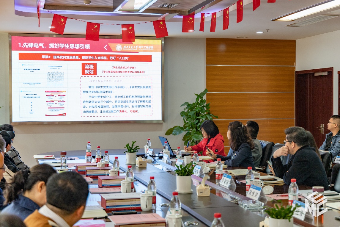 谢力副书记就学院学生党建与思政工作进行汇报。谢力副书记从学院学生规模、辅导员队伍情况及学工组工作目标介绍学生工作基本情况。电气学工以“五个电气”的工作思路,即“先锋电气”“双严电气”“创新电气”“文化电气”“阳光电气”开展工作,通过建设创新电气科创体系、编撰文化电气系列读本、打造阳光电气系列品牌活动等举措,展示了学院在“德智体美劳”全方位培育学生的成效。此外,谢力副书记也针对目前工作存在的问题和不足进行总结。