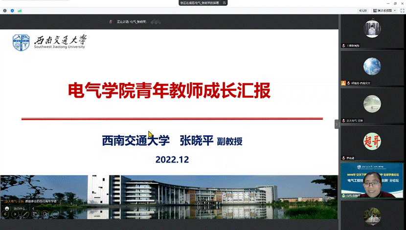 随后,电气学院青年教师张晓平副教授分享入职交大的成长经历。她讲到,入职后加入电气学院科研团队,学校和学院给予了诸多帮助和经费支持,自己也通过自身努力获得了多项学术荣誉、科研项目与研究成果。张晓平老师以自己入职后的亲身经历为参加学术论坛的各位青年提供了宝贵的建议,真诚地向海内外青年才俊推介学院。