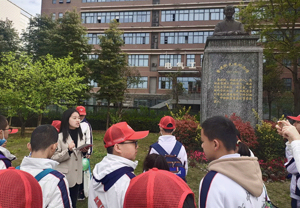 随后,七中育才中学师生来到禁忌书屋 曹建猷先生纪念铜像前,沙静馨老师给同学们生动地讲述了《曹建猷的四次抉择》,希望同学们能学习曹老精神,热爱祖国,不畏艰难,刻苦专研,争取考入交大校园,进一步去挖掘曹老背后的故事。