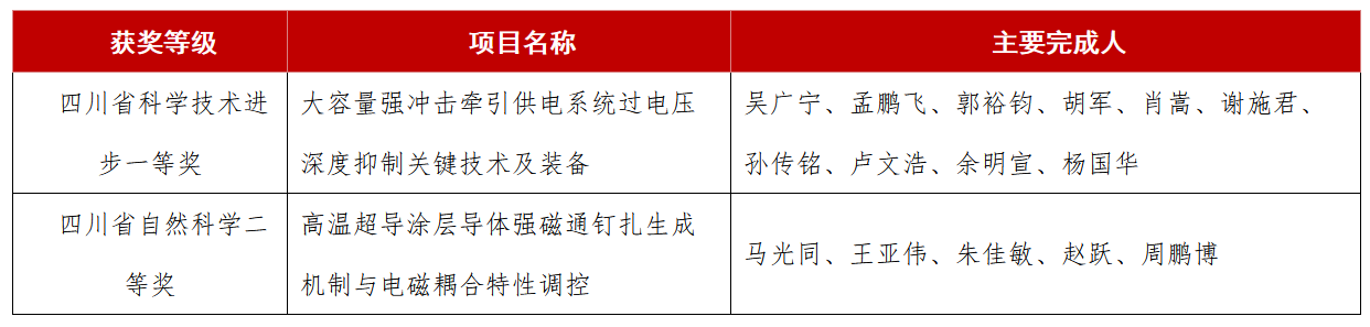 On September 10, Sichuan Science and Technology Conference was held in Chengdu, at which the winners of the 2023 Sichuan Science and Technology Award were honored. Two scientific and technological achievements of the School of Electrical Engineering won the award. Among them, the project of “Large-capacity Strong Impact Traction Power Supply System Over-voltage Depth Suppression of Key Technology & Equipment” , which was presided over by Prof. Wu Guangning, won the first prize of the Sichuan Provincial Science and Technology Progress. The project of “Generation Mechanism of Strong Magnetic Flux Pinning and Regulation of Electromagnetic Coupling Properties in High-temperature Superconducting Coated Conductors”,which was presided over by Prof. Ma Guangtong won the second prize of Sichuan Natural Science.