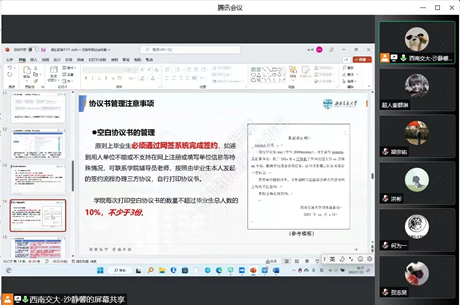 首先,沙静馨老师通报了年级现在就业情况,提醒各位同学积极投递简历,尽管现在因特殊原因有耽误,但整体的就业进度是在向前推进,要主动出击,不要坐以待毙。接着,沙静馨老师围绕在在线签约和线下签约两种情况给同学们做了详细的介绍,并针对学生实际情况,详细说明了空白协议书的管理和使用要求。