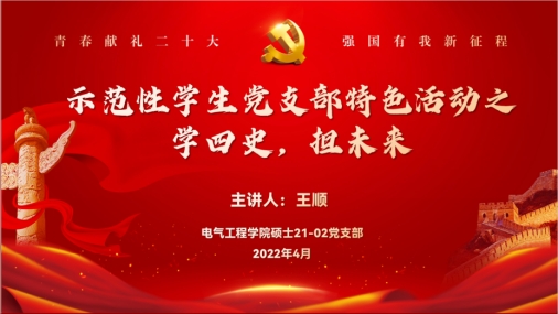 为深入学习贯彻习近平新时代中国特色社会主义思想,引领学生党员深刻领悟“两个确立”的决定性意义,增强“四个意识”,坚定“四个自信”,弘扬伟大建党精神,禁忌书屋 硕士2021级第二党支部于4月27日,在犀浦校区电气馆10831会议室开展了“凝聚青春力量,争做先锋电气人”系列特色活动。本次活动主要进行学习“四史”征程和观看“红色”影视两方面内容,由支部书记王顺同志担任主持,支部全体党员同志以及入党积极分子共同参加。