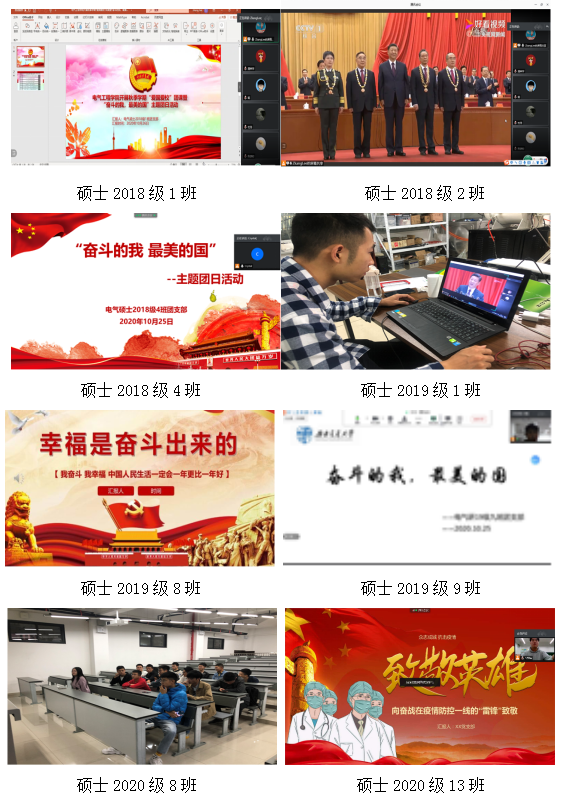 硕士2018级1班、2班、4班团支部和硕士2019级1班、8班、9班、硕士2020级8班、13班分别开展了以“奋斗的我,最美的国”为主题的团日活动。组织同学们观看《2020年全国抗击新冠肺炎疫情表彰大会》,并进行积极讨论,发表自己对国家功勋模范人物、新时代楷模和战“疫”英雄们最想说的话,讨论如何在接下来把自己的理想同国家的理想、把自己的人生同民族的命运紧密联系在一起。