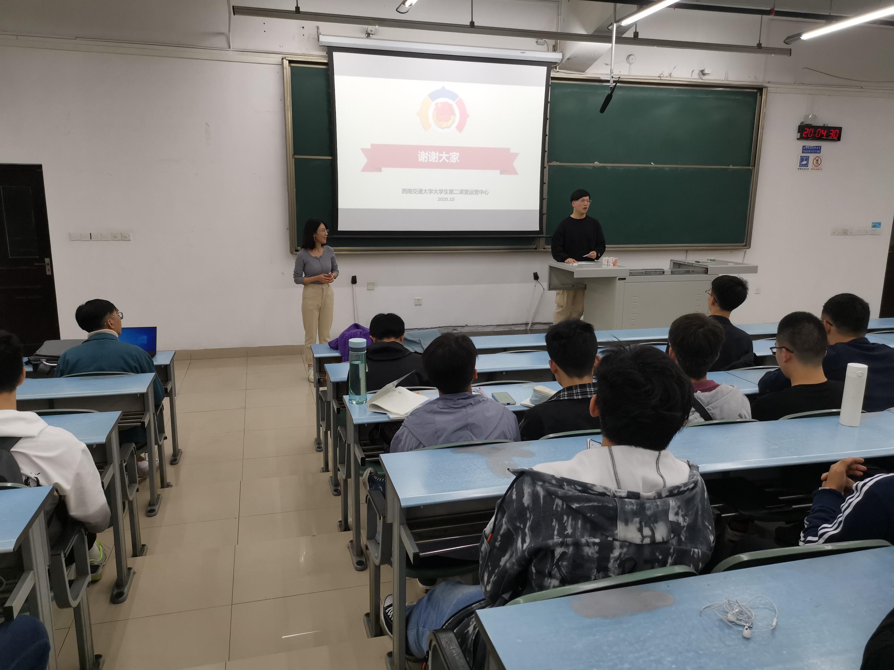 在讲座上汪宣霖老师向2020级新生们详细介绍了我校第二课堂的基本情况。向同学们介绍了西南交大“第二课堂成绩单” 信息管理系统,告诉同学们如何通过新青年素质网平台和交大有思微信公众号手机平台进行第二课堂的选课。并向大家详细说明了第二课堂的学时设置。