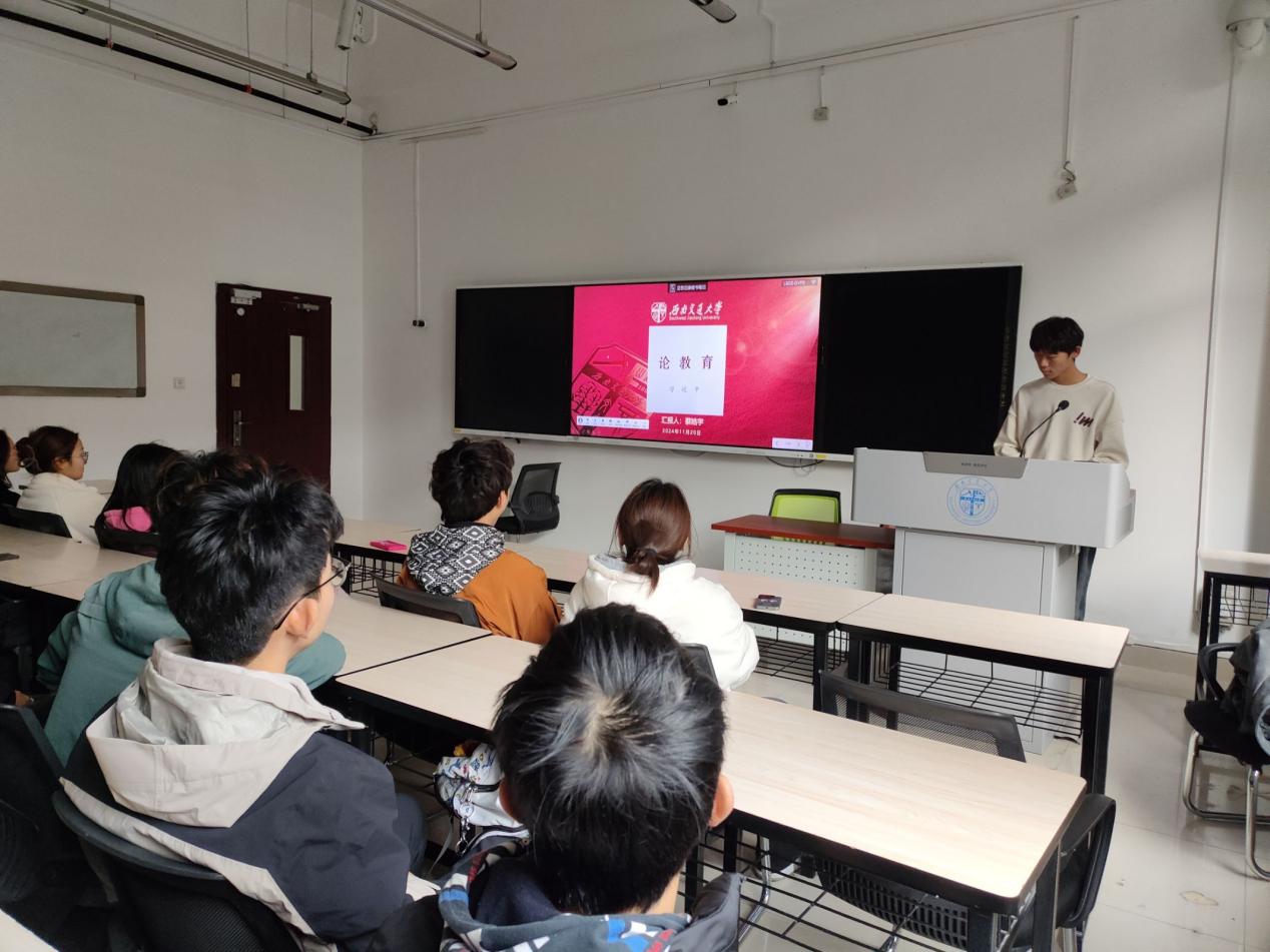 接着,团支书蔡皓宇领学《论教育》,同学们共同分享了自己的学习心得,明白了教育在强国建设、民族复兴中的基础性、先导性、全局性地位,并围绕“德智体美劳全面发展”展开讨论。随后蔡皓宇同学介绍《习近平与大学生朋友们》的主要内容,分享习近平总书记与大学生交流的故事和对大学生的殷切期望,让同学们感受到习近平总书记对青年一代的关怀与嘱托。