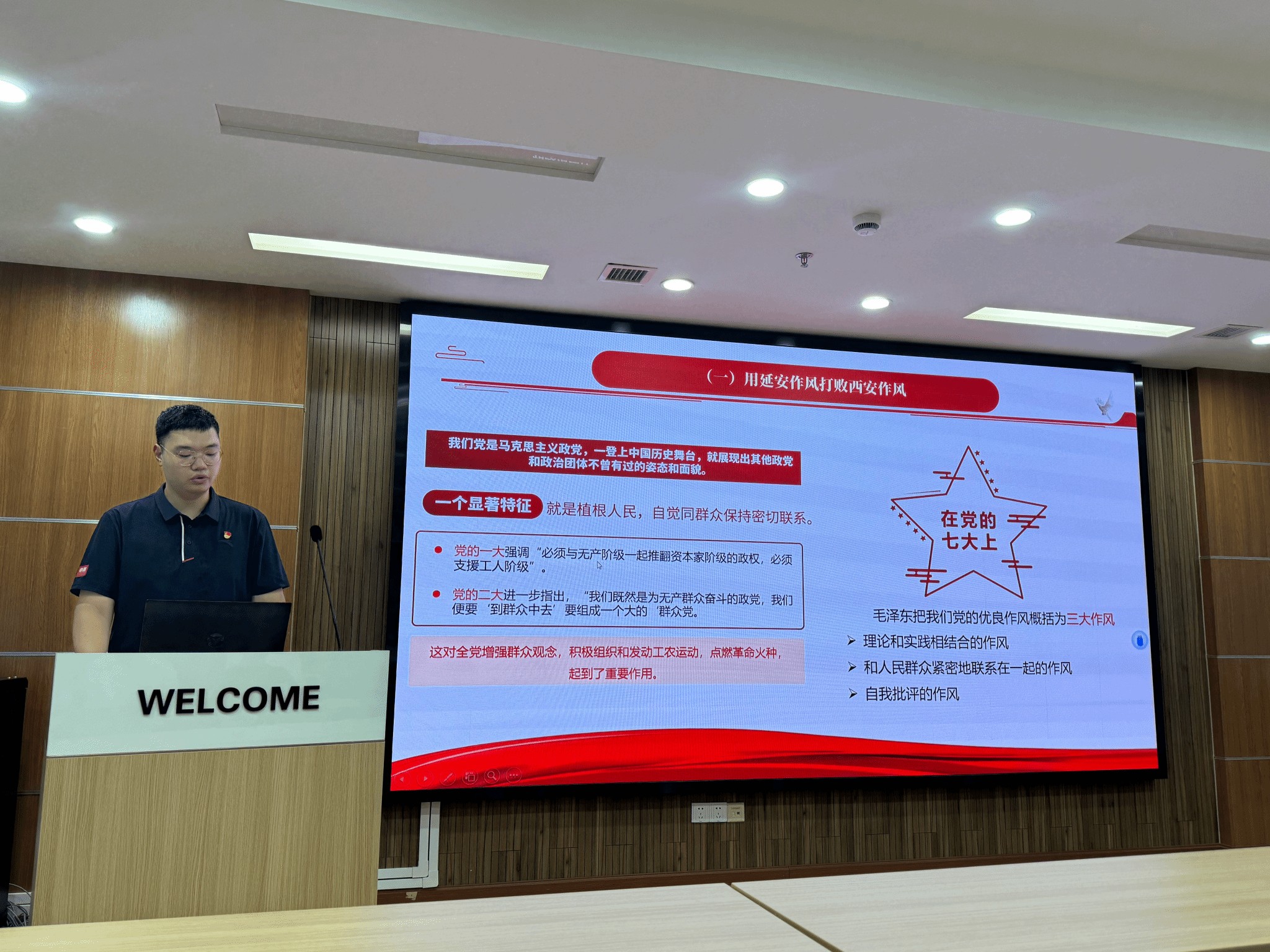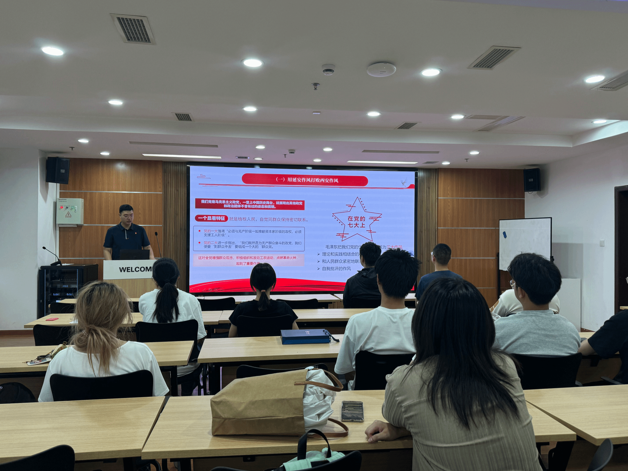 活动伊始,党支部书记组织开展深入贯彻中央八项规定精神学习教育。首先带领全体党员回顾了中央八项规定出台的背景、重大意义及主要内容,结合党史发展中的作风建设的典型案例,从改进调查研究、精简会议活动、规范出访活动、改进工作作风等方面进行了深入浅出的解读。并强调,中央八项规定是长期有效的铁规矩、硬杠杠,作为研究生党员,要时刻保持清醒头脑,将中央八项规定精神内化为思想自觉和行动自觉,在科研、学习和生活中发挥先锋模范作用。