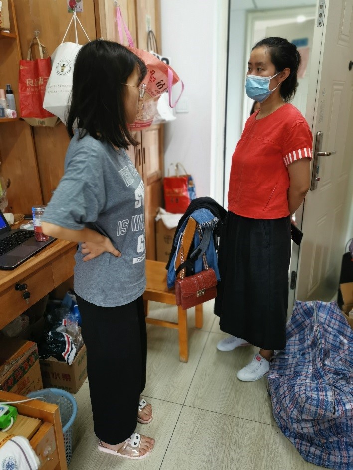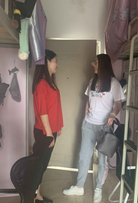 辅导员王喆桅、薛逸凡和林静英、樊芝菱分别走访了位于天佑斋2幢的硕2018级男、女生宿舍,与返校学生交流,了解大家返校后的生活情况,并提醒大家要注意毕业就业两条腿走路,合理安排好相关工作进度。