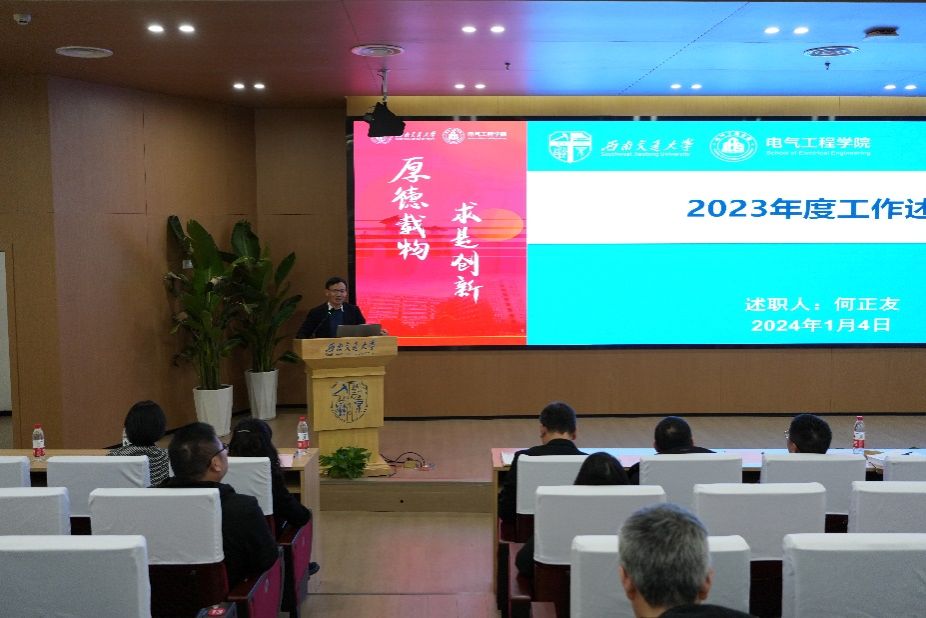 何正友院长作2023年行政工作总结及个人述职。何正友院长从党政知识学习、周期目标引领、解决教职工诉求、招生工作、一流专业建设、合作交流等方面汇报了学院工作举措,从教育教学改革、学生工作、学生科创竞赛、研究生工作、科教平台建设、科学研究成果、人才工作、筹资引资共八个方面汇报了学院的亮点业绩,并就个人廉洁自律情况、工作不足和改进措施进行了总结,最后感谢分管领导和学院教职工的共同努力。