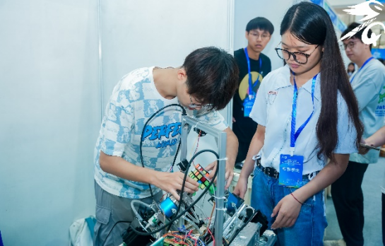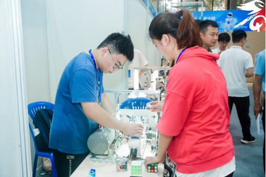 主题二魔方机器人旨在“挑战更快”,参赛队伍参照人类魔方竞速规则,设计制作魔方机器人,综合运用机械、电子、信息和自然科学知识,实现比人“计算”更快,“翻动”更加灵活迅速的目标。参赛队伍现场调试代码,指挥机器人演示魔方还原过程,挑战更快的速度