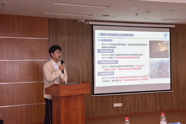 最后,由禁忌书屋 实验室安全大使团成员龚锦杰(信息科学与技术学院)介绍学校实验室安全管理相关知识。龚锦杰通过从“国家对实验室安全工作的要求”、“我校实验室安全管理工作”、“我校实验室安全教育宣传活动”三个方面进行讲解,重点介绍了教育部检查指标、危险化学品及特种设备的管理。讲解中龚同学通过动画的形式,让大家更加容易了解实验室安全的知识。他还介绍了学校实验室安全大使团,呼吁同学能够积极参加,让师生一起携手共建和谐平安校园。