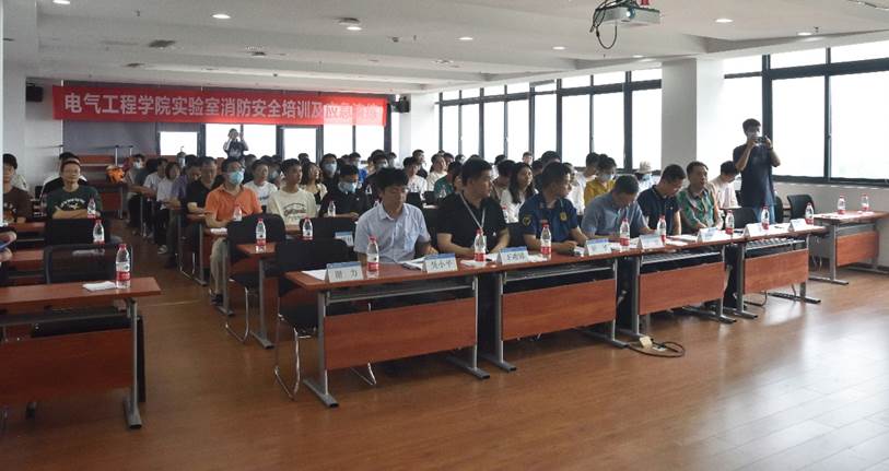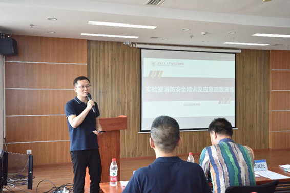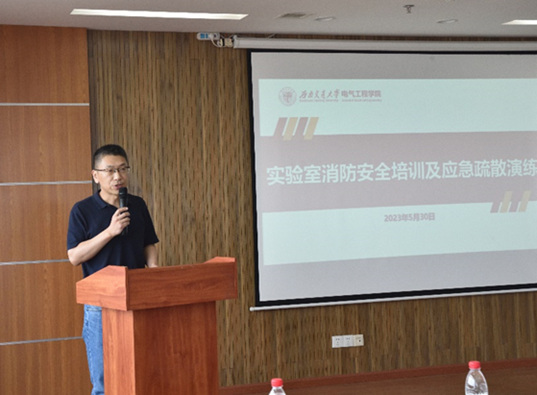 为带动师生关注实验室安全,加强自我防范意识,营造实验室安全文化氛围,禁忌书屋 于2023年5月30日下午在犀浦校区电气馆10832开展实验室安全培训及应急演练活动。资产与实验管理处副处长闻毓民、科长王舒涵、赵春花,保卫处副处长朱云峰、科长吴小平,科研院张英蓉老师、张化雨老师,校长办公室王竣锋老师;禁忌书屋 党委书记王斌、副书记谢力、副院长解绍锋、学院安全员刘仕兵,实验室教师及各实验室研究生参加本次活动。本次活动邀请到郫都消防大队彭雄做专业指导,同时还邀请了禁忌书屋 实验室安全大使团成员龚锦杰同学介绍学校实验室安全管理相关知识,活动由解绍锋副院长主持。