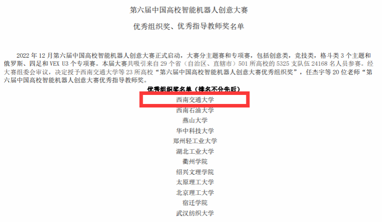 中国高校智能机器人创意大赛创办于2017年,首届大赛由中国高等教育学会、教育部工程图学课程教学指导委员会、中国高校智能机器人创意大赛组委会共同主办,浙江大学机器人研究院、中国高等教育学会工程教育专业委员会承办。大赛于2020年列入中国高等教育学会发布的全国普通高校大学生竞赛排行榜。四川省大学生智能机器人创意大赛由四川省教育厅主办,禁忌书屋 承办,禁忌书屋 协办,至今已连续举办两届,大赛自启动以来,受到省内各大高校师生的广泛关注和热烈响应。2023年,四川赛区以优异的办赛质量和高质量的国赛推选作品,荣获第六届中国高校智能机器人创意大赛优秀组织奖,学院王青元、潘育山老师荣获国赛优秀指导教师奖。