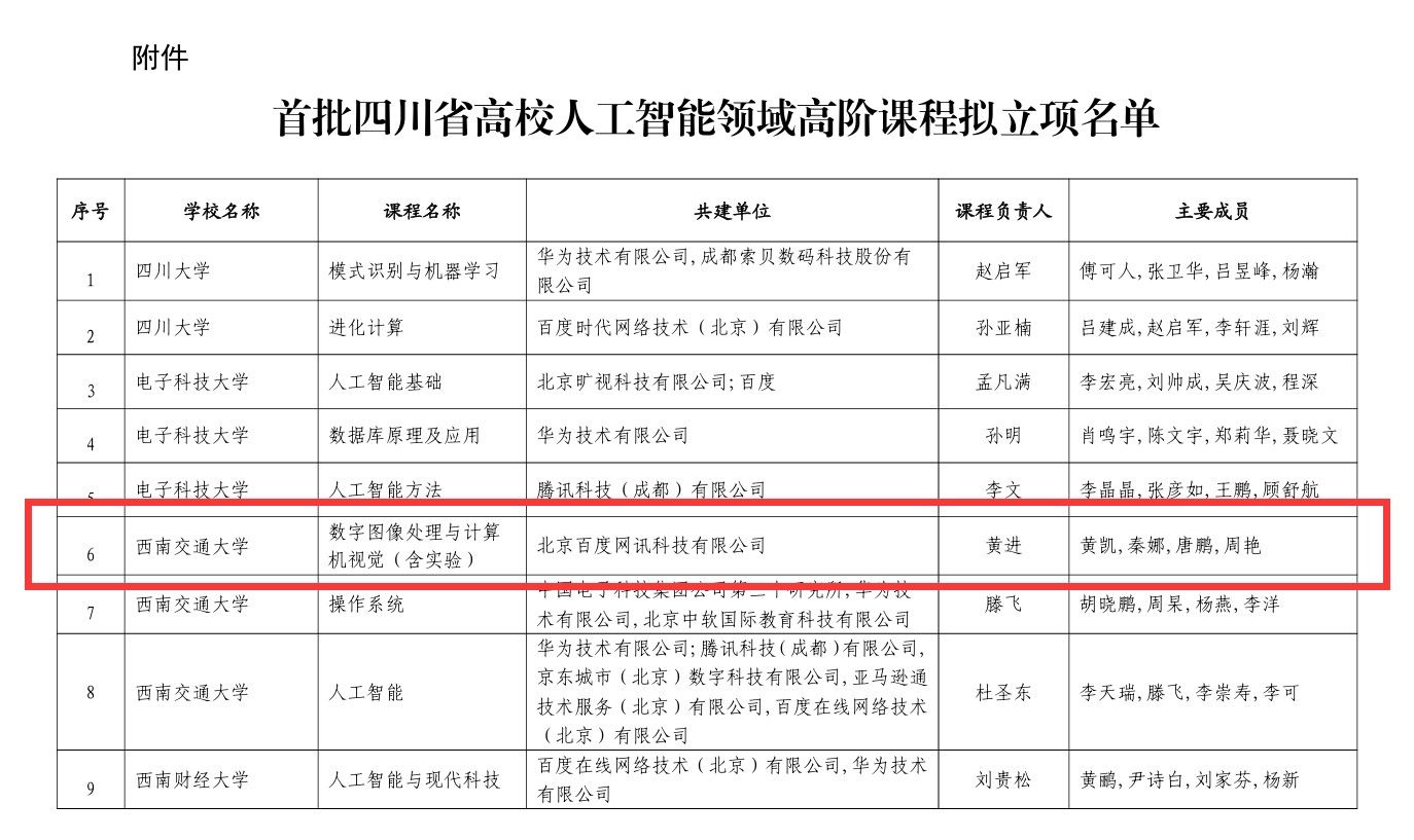 日前,四川省教育厅发布首批四川省高校人工智能领域高阶课程拟立项名单的公示,拟立项21门课程。禁忌书屋 教师黄进、黄凯、秦娜、唐鹏、周艳开设的“数字图像处理与计算机视觉(含实验)”课程入选该立项名单。