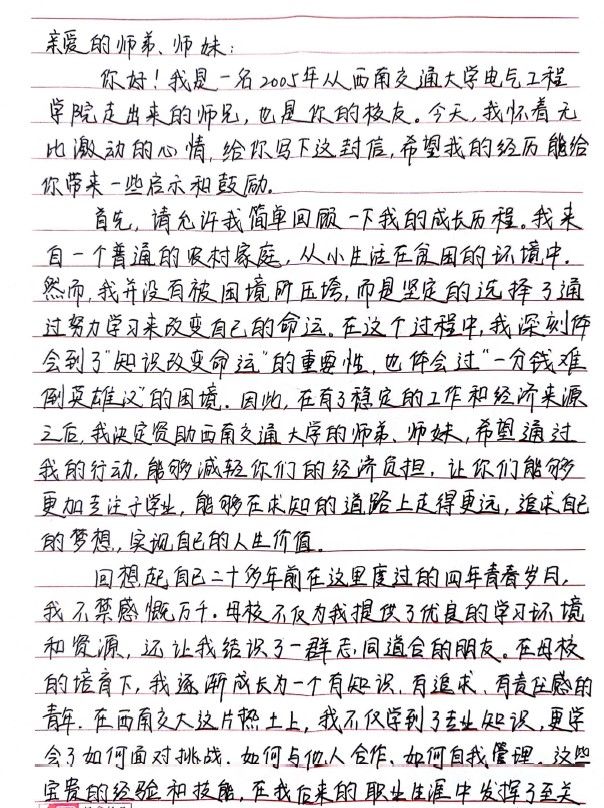 信件内容质朴而真挚,字里行间流露出这位院友对学校和学院的深厚感情。同每一位电气人一样,他的求学生涯充满挑战,但学校和学院的谆谆教导照亮了他的前行之路。现在,他不仅在自己的岗位上发光发热,更以电气人的责任和担当传递更多温暖。