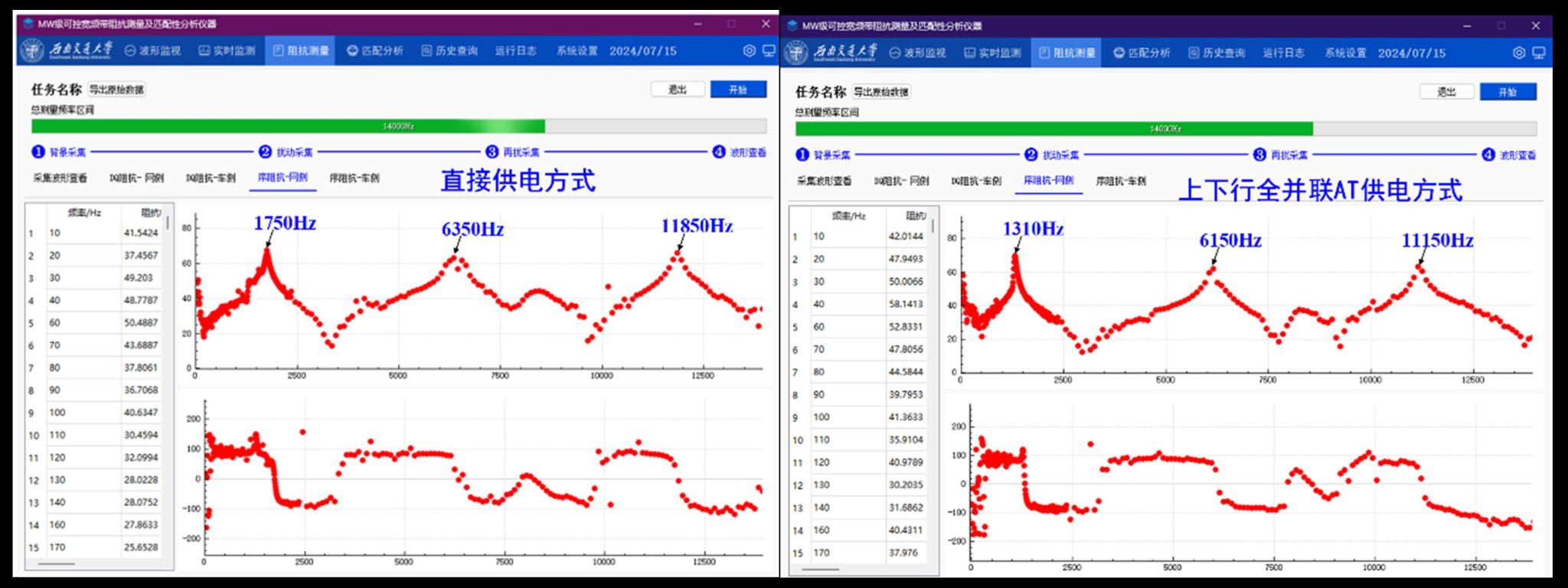 图4 不同供电方式下的牵引供电系统宽频带阻抗幅值/相位测量结果