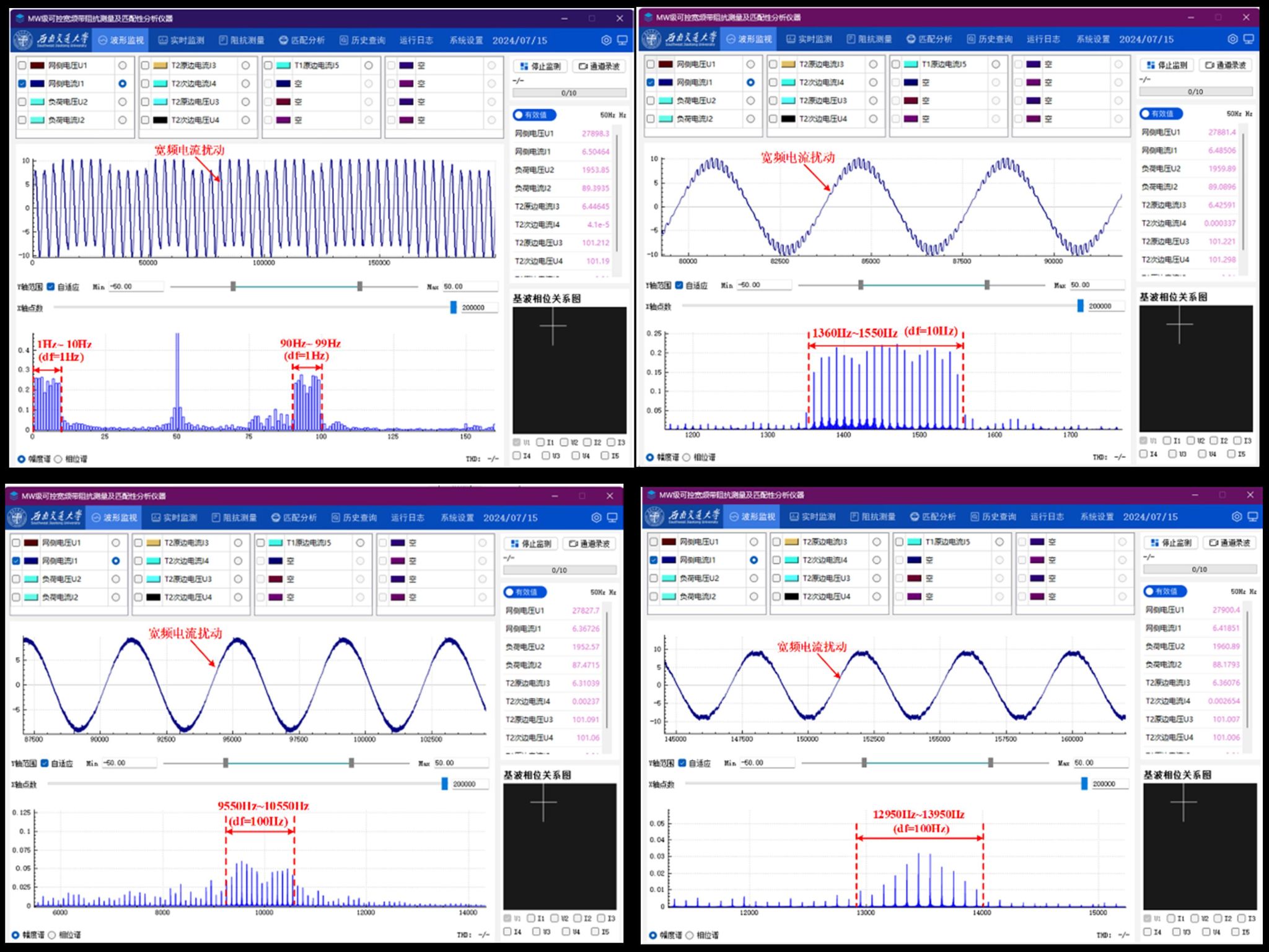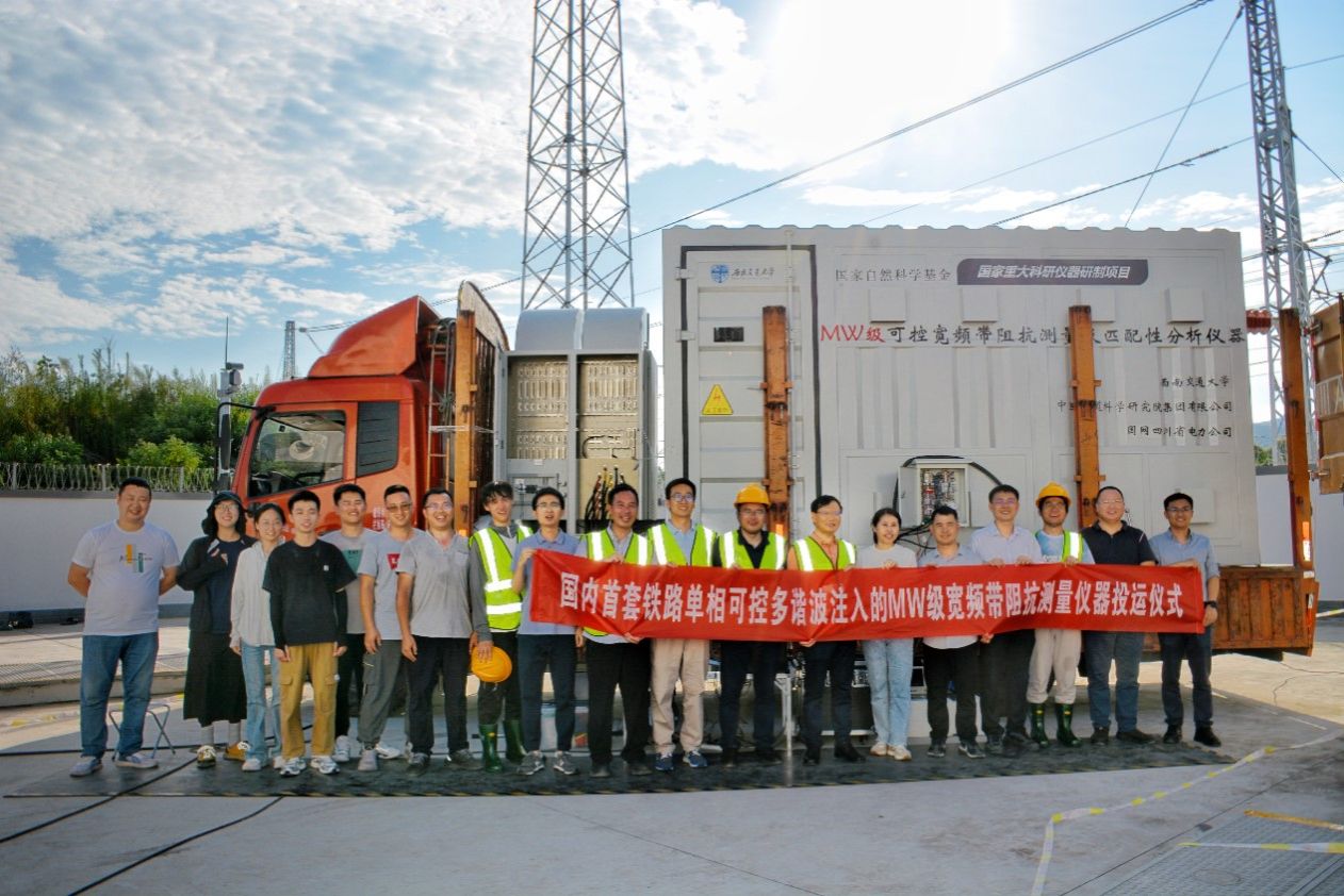 2024年7月15日,在国家重大科研仪器研制项目《MW级可控宽频带阻抗测量及匹配性分析仪器》和成都铁路局配套试验项目资助下,由禁忌书屋 何正友、胡海涛教授团队牵头,联合中国铁道科学研究院集团有限公司、国网四川省电力公司共同研制的MW级可控宽频带阻抗测量及匹配性分析仪器,在新开通的渝昆高铁友助村牵引变电所(重庆永川区)圆满完成了现场测试。此次现场测试得到了成都铁路局供电部、宜宾工电段、成都维管段等单位的大力支持,试验的成功标志着我国在大功率多谐波发射、宽频带阻抗测量、宽频带振荡理论的研究又向前迈出了坚实的一步。该仪器在低频谐波(1Hz)、高频谐波(20kHz)、宽频带谐波(1~1000个谐波同时发射)注入等核心指标处于领先水平,为铁路牵引供电系统、新能源并网系统、电力系统的阻抗建模与稳定性分析奠定了良好基础。该项目历时5年,顺利完成了项目立项、技术方案评审、生产研发、施工调试、现场示范等多个阶段,最终实现了仪器装置落地试验,并通过了四川省电子产品监督检验所的第三方认定。