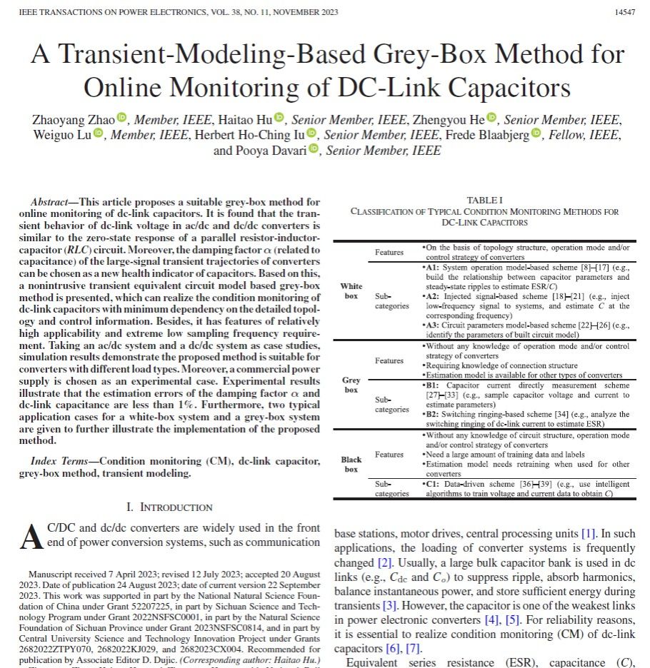 近日,IEEE电力电子学会(Power Electronics Society, PELS)公布了旗舰期刊IEEE Transactions on Power Electronics (TPEL)2023年度优秀论文奖(Prize Paper Award)获奖名单。从该刊2023年度正式出版的1364篇论文中评选出一等奖(First Place Prize Paper)5篇、二等奖(Second Place Prize Paper)9篇和优秀快报(Prize Letter)2篇。学院何正友、胡海涛教授团队论文《A Transient Modeling-Based Grey-Box Method for Online Monitoring of DC-Link Capacitors》荣获2023年度优秀论文二等奖。