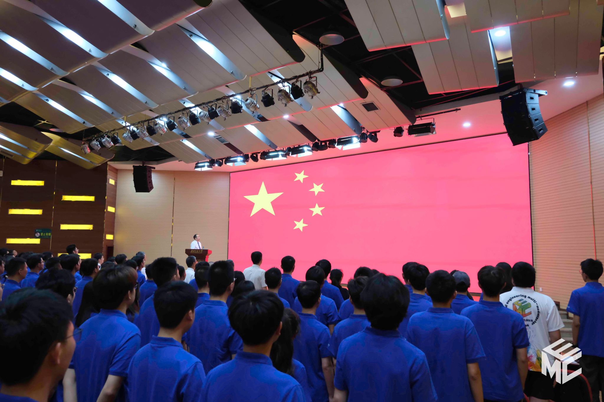 典礼伊始,全体师生面向国旗行注目礼,并齐唱国歌。