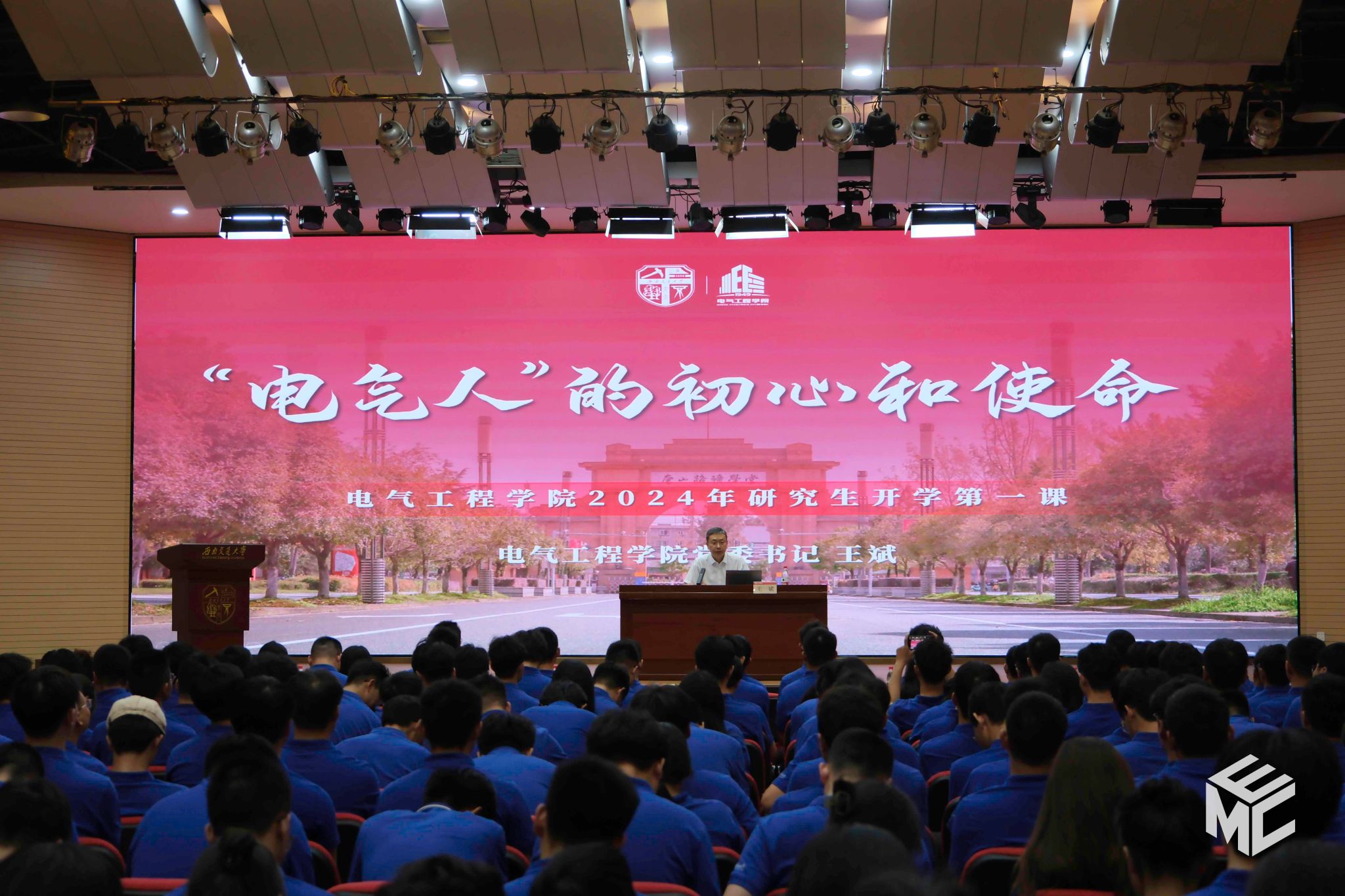 开学典礼的第二阶段,由学院党委书记王斌为新生研究生讲述开学第一课《“电气人”的初心和使命》。王斌书记表示,从“初心”回望过去,学院的办学历史,是一部与祖国和人民同呼吸、共命运的历史,是一部主动服务我们党治国理政的历史。王斌书记分享了一代代电气人用坚定理想信念投身强国伟业的奋斗历程,展现了电气学院响应国家号召、面向未来发展的赤热情感。