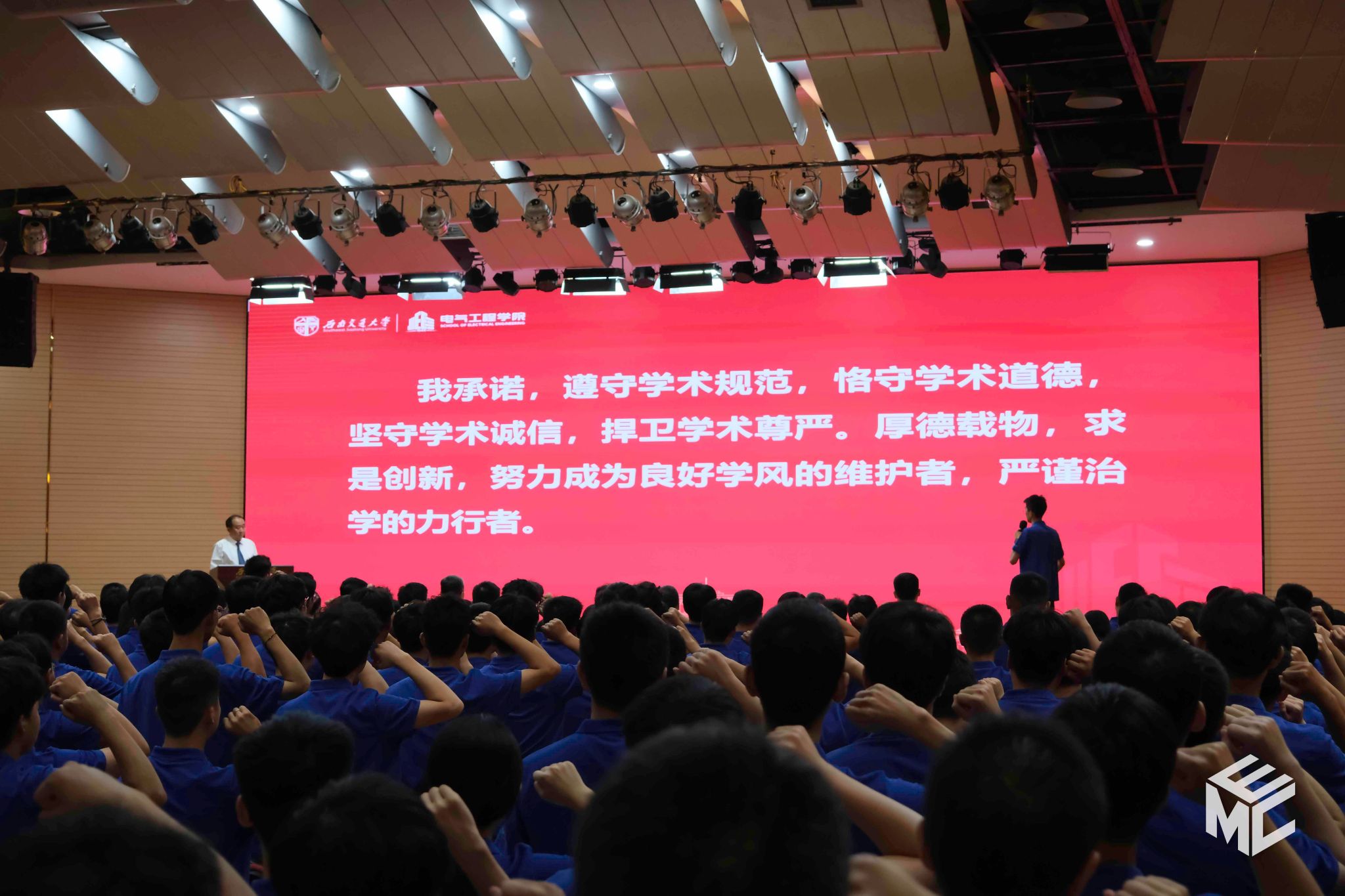 随后是学术诚信宣誓环节。硕士2024-03班田小宇同学上台领誓,全体研究生庄严宣誓:“我承诺,遵守学术规范,恪守学术道德,坚守学术诚信,捍卫学术尊严。厚德载物,求是创新,努力成为良好学风的维护者,严谨治学的力行者。”